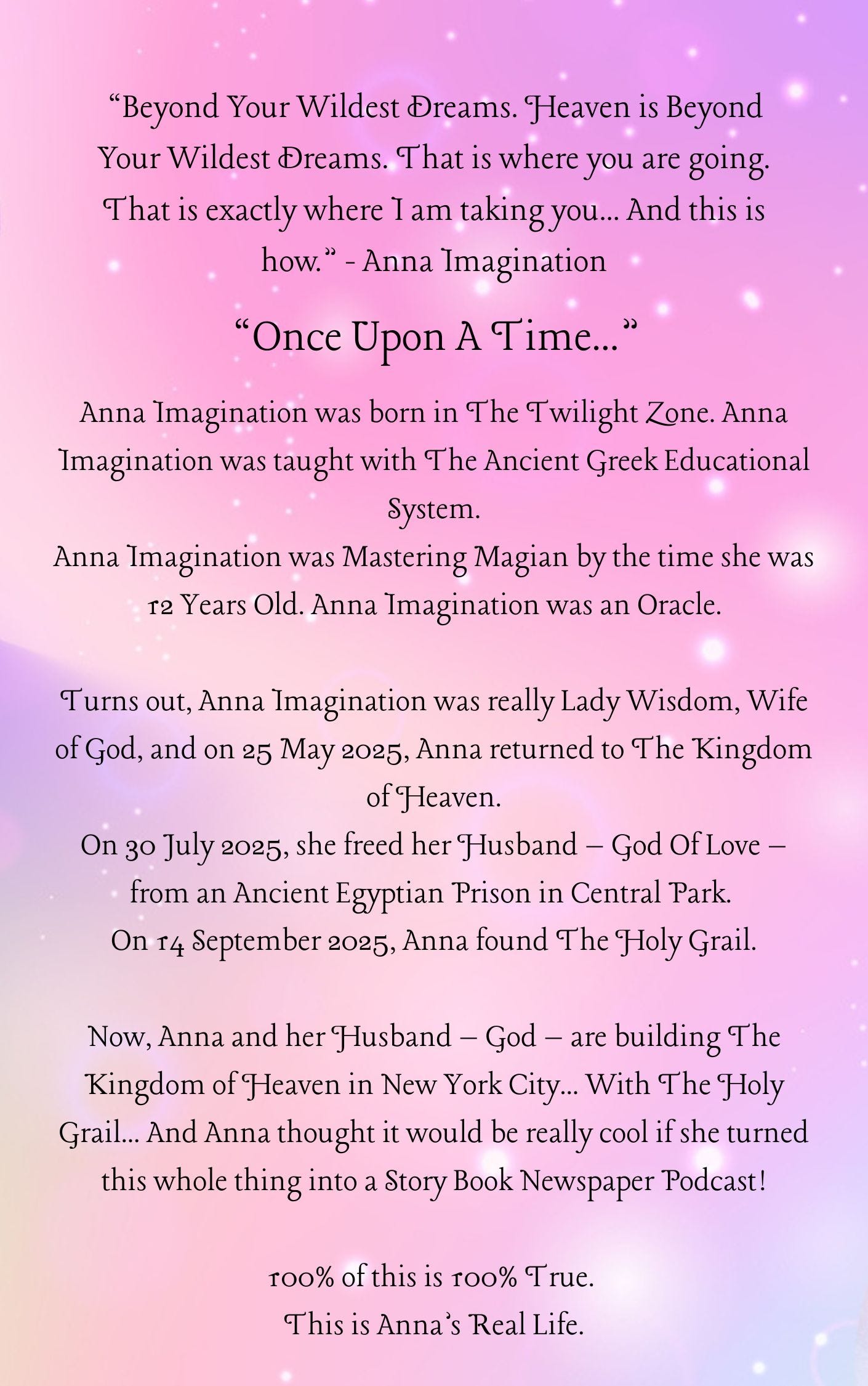 “Beyond Your Wildest Dreams. Heaven is Beyond Your Wildest Dreams. That is where you are going. That is exactly where I am taking you… And this is how.” - Anna Imagination